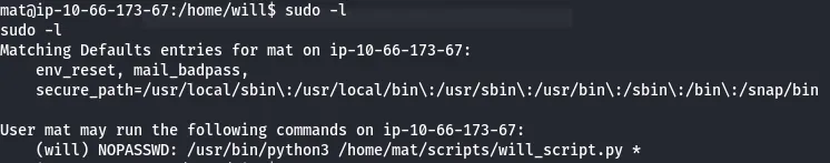 Checking Sudo permissions shows that Mat is allowed to run Python as root to execute will’s script.
