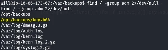 I see that Will is in the adm group which allows us to read special files. I use the find command to search all files with that group name and find a base64 encoded SSH private key under /opt/backups .