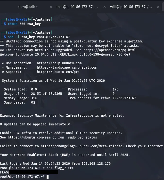 Searching the system again reveals that flag six is under will’s home directory, meaning we’ll have to pivot to his account before root.