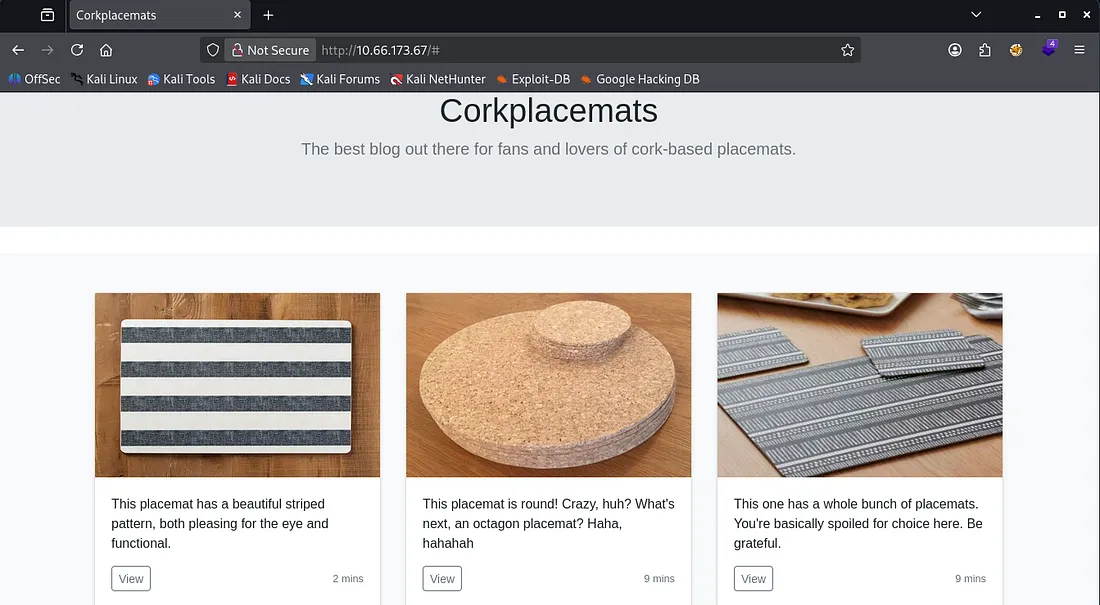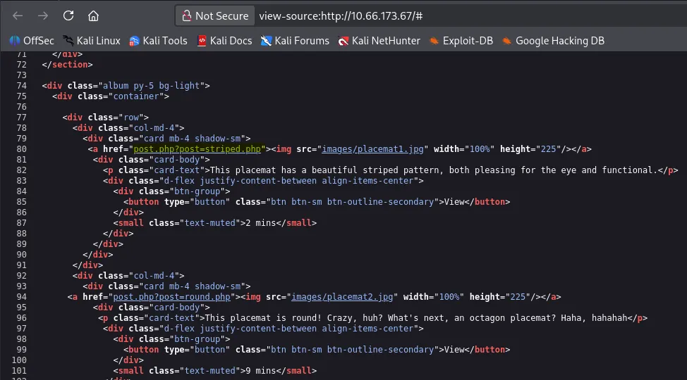 While checking the source code, something sticks out to me. When clicking on any of the placemat posts, it loads by making a GET request to post.php with a post parameter indicating which picture should load for the blog post. Smells like an LFI vulnerability.