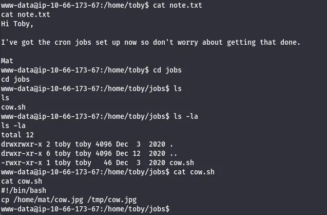 Checking the other user’s home directories shows a note left for Toby hinting at a cronjob being executed. Looking at the cronjobs running, mat executes toby’s cow.sh script every minute.