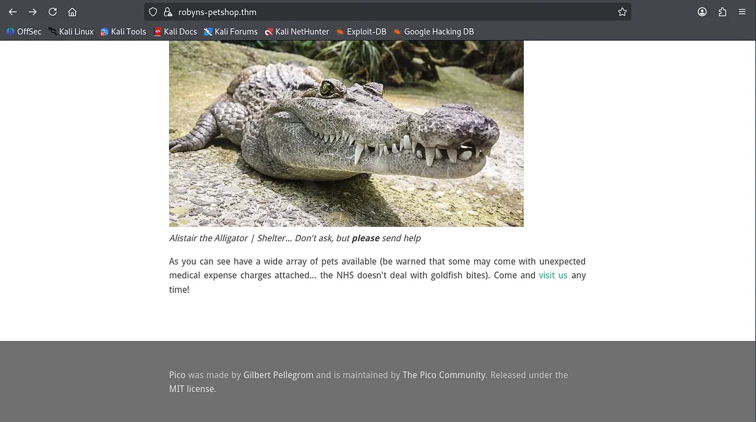 Looks like a typical webpage listing animals to be rehomed, including a giraffe and an alligator (wow). I find out that the server is running Pico CMS and also discover an email for staff under the contact us page.