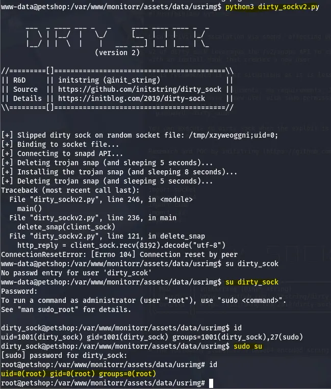 I download the dirtysockv2.py script from GitHub on the compromised system and ran it. Now we have to switch user to dirty_sock and then sudo su to grab a root shell.