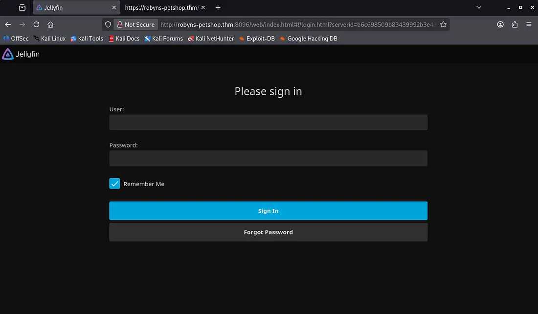 Nothing in the source code and no other tabs to navigate to so I hop on over to port 8096 and find a Jellyfin login panel.