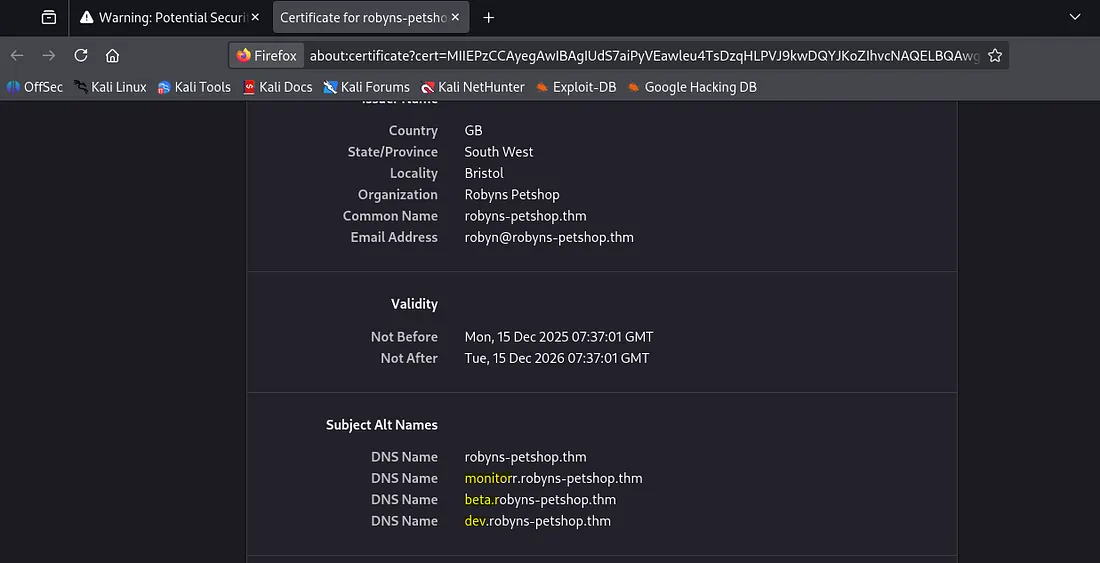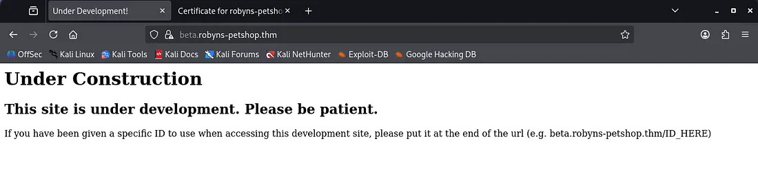 beta.robyns-petshop.thm required a specific ID to access the site as it was currently under development.