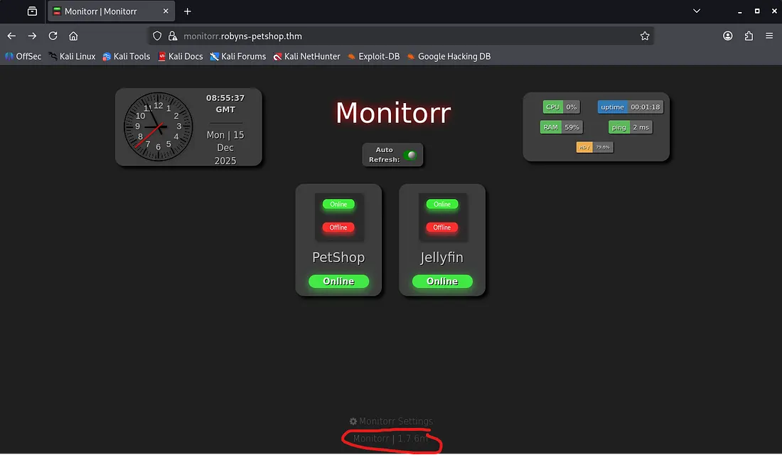 Finally, at monitorr.robyns-petshop.thm we have a monitor panel with things like general system info, a date/time clock, and links to each site (pointed toward localhost so they were unreachable).