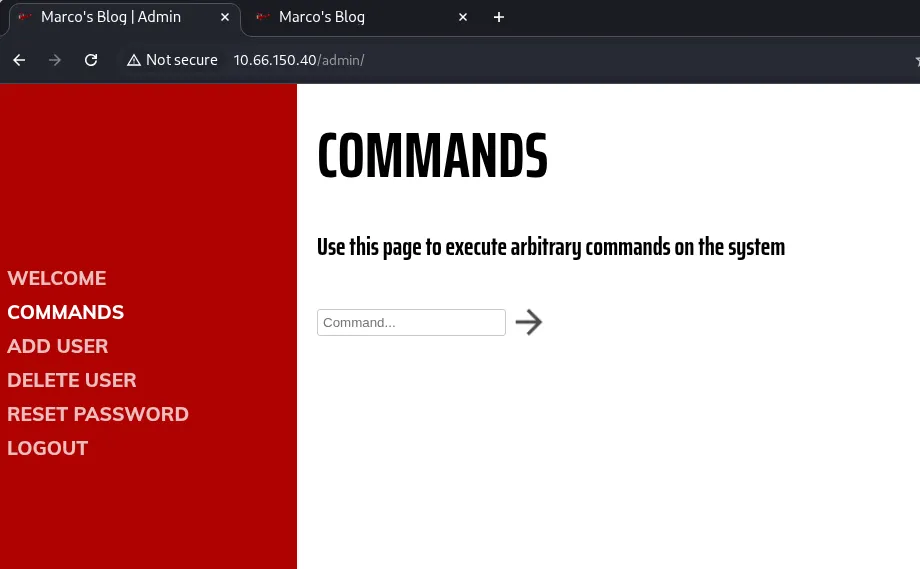 Logging in, there’s tabs for each API endpoint we found earlier as well as a command panel. It returns invalid command for things like ls and cat meaning we’ll need to bypass the filter in order to get a shell.