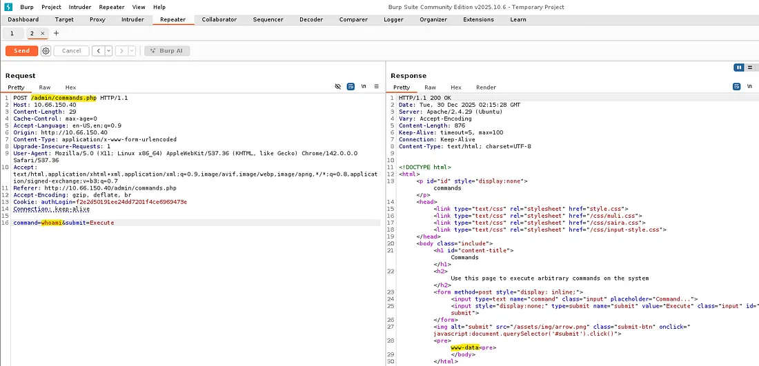 Capturing it in Burp Suite discloses another php page, so let’s fuzz for places under /admin/ with .php extensions for any more things to use.