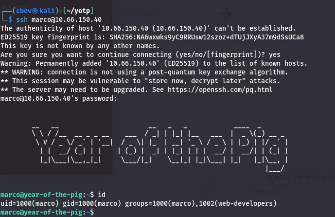 Before spending more time on the webpage, I decide to credstuff SSH with marco’s user and pass. This actually works, which probably means that anything else on the site was a big waste of time.