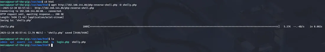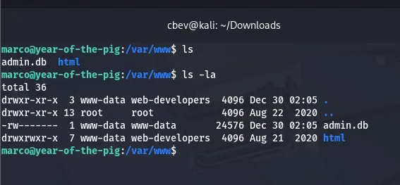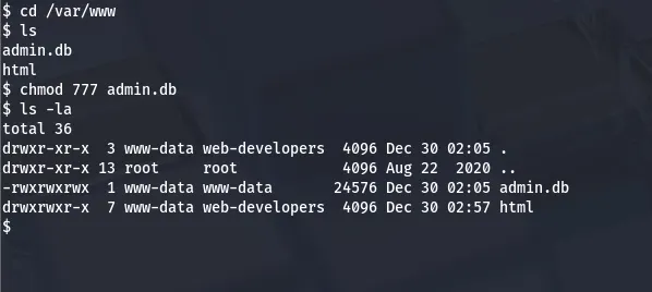 While checking the usual privesc routes, I find an admin.db file owned by www-data. We don’t have access to it as of now so uploading a shell in /var/www/html/ will let us.