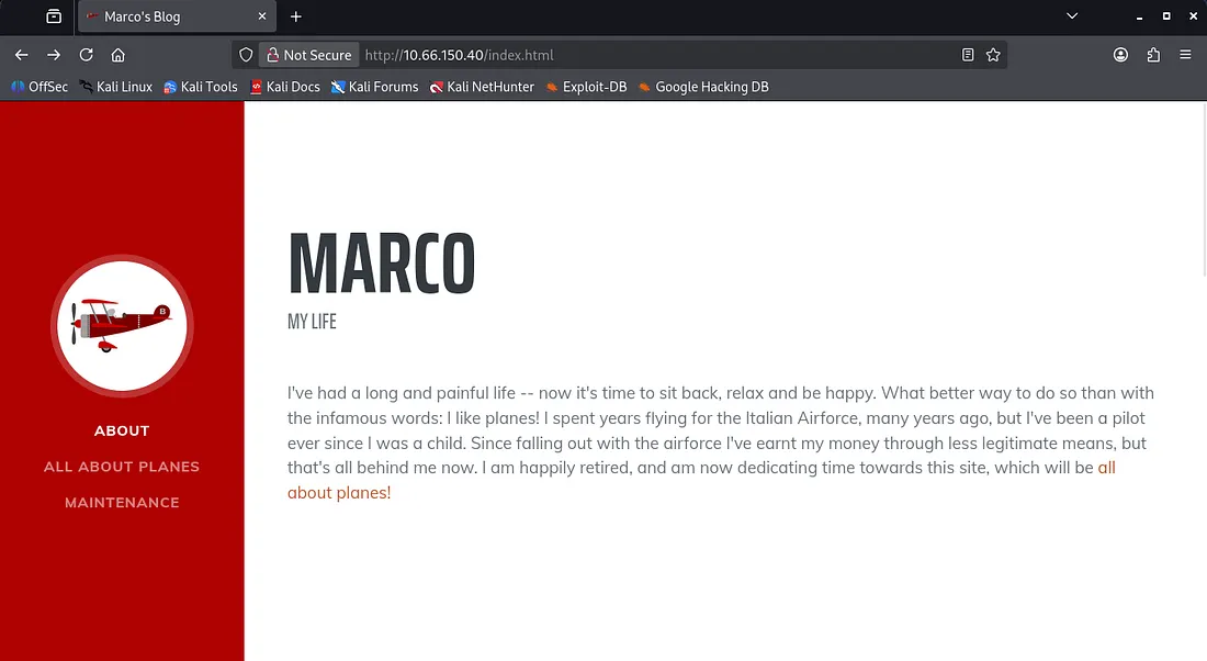 We have a static html page dedicated towards Marco’s love for planes. There’s a bit of info here we could cram into a wordlist if needed, seeing as he mentions tons of plane names and some friends too.