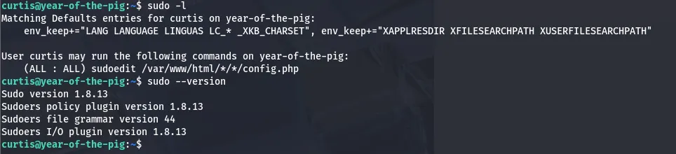 Here we can grab the second flag in curtis’ home directory. Listing sudo commands shows that we’re able to use sudoedit on the file /var/www/html/*/*/config.php.