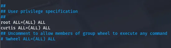 Uploading that script to the machine allows us change the contents of /etc/sudoers. Finally, we can add ourselves (curtis) to a new line with all sudo privs and execute sudo /bin/bashto get a root shell.