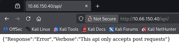 Gobuster found some interesting endpoints for us to work with. There’s an API page that accepts POST requests, but more importantly the verbose option is enabled. This means there may be a chance to validate to it and grab more info.