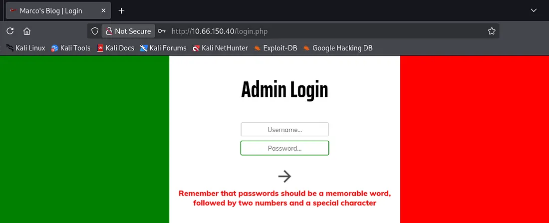 We also find a login panel for admins; I tried some basic SQLi but nothing came of it. When attempting to login we are given a very interesting error, which leaks the password structure for the site. It is also running on PHP judging from the url.