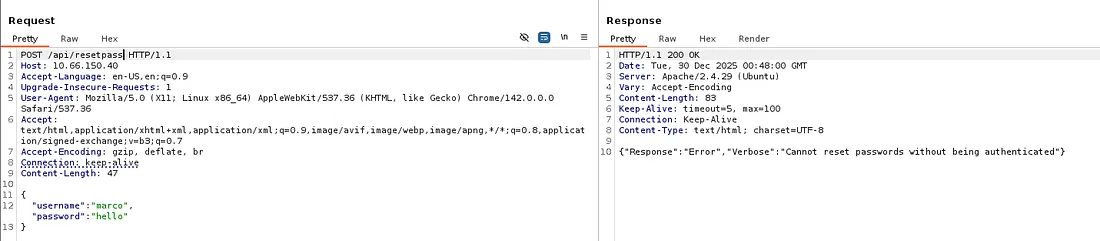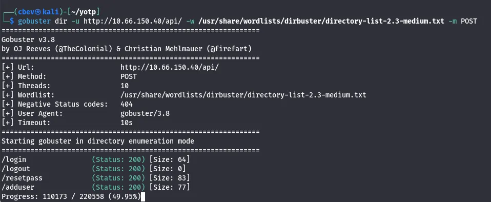 I send POST requests using gobuster to enumerate /api/ endpoints and find some very nice functions to mess around with. However, we cannot add a user or reset passwords without being authenticated first.