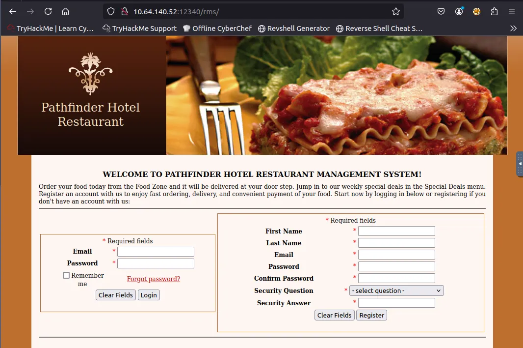 Gobuster returns a single hit on a restaurant management system page. I’ll register and see if anything of interest comes about, however if not, then we can start looking for exploits against the outdated PHP and Apache versions.