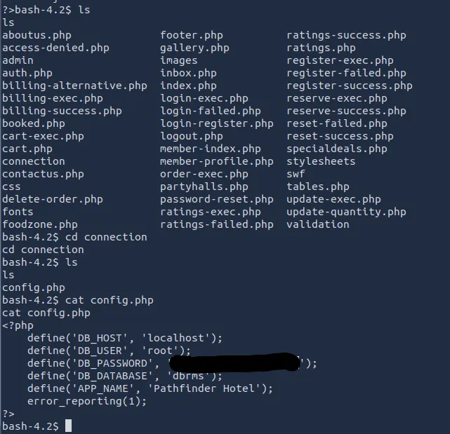 I find a database password for root under a config file in the ‘connection’ directory. I didn’t get anything from the DB so it’s back to looking around for other vulnerable paths.