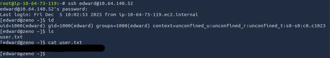 I thought I’d have to do some playing around with the service but the creds found worked for Edwards account too. Now we can SSH into edward’s account and grab our first flag: